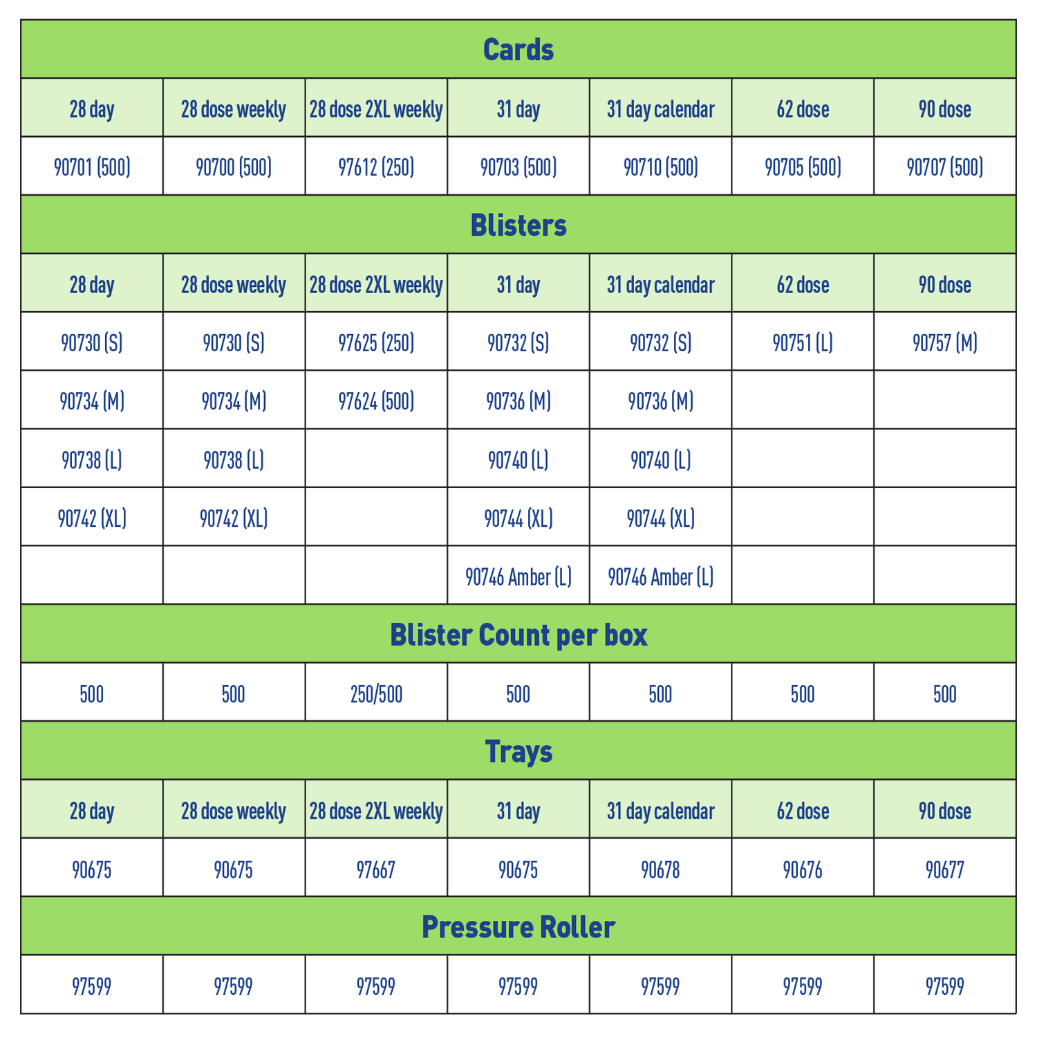• 28-Day Cold Seal Blisters to be used with 28-Day Cards (90701 or 90700) and the 31-Dose Sealing Tray (90675)
